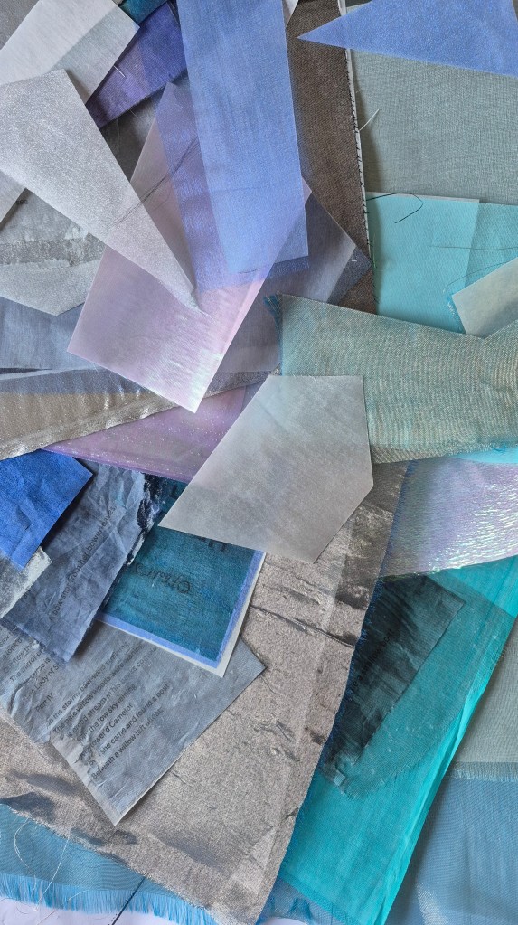 The choice of materials for “The Mirror Crack’d” was key to the whole work. Reflective shiny fabrics, glitzy sheers, metallic silk, and laminated plastics were all selected to suggest the mirror. Words from the poem were made into fabric using paper lamination. A cool colour palette of blues, greys and purples, with a hint of silver.