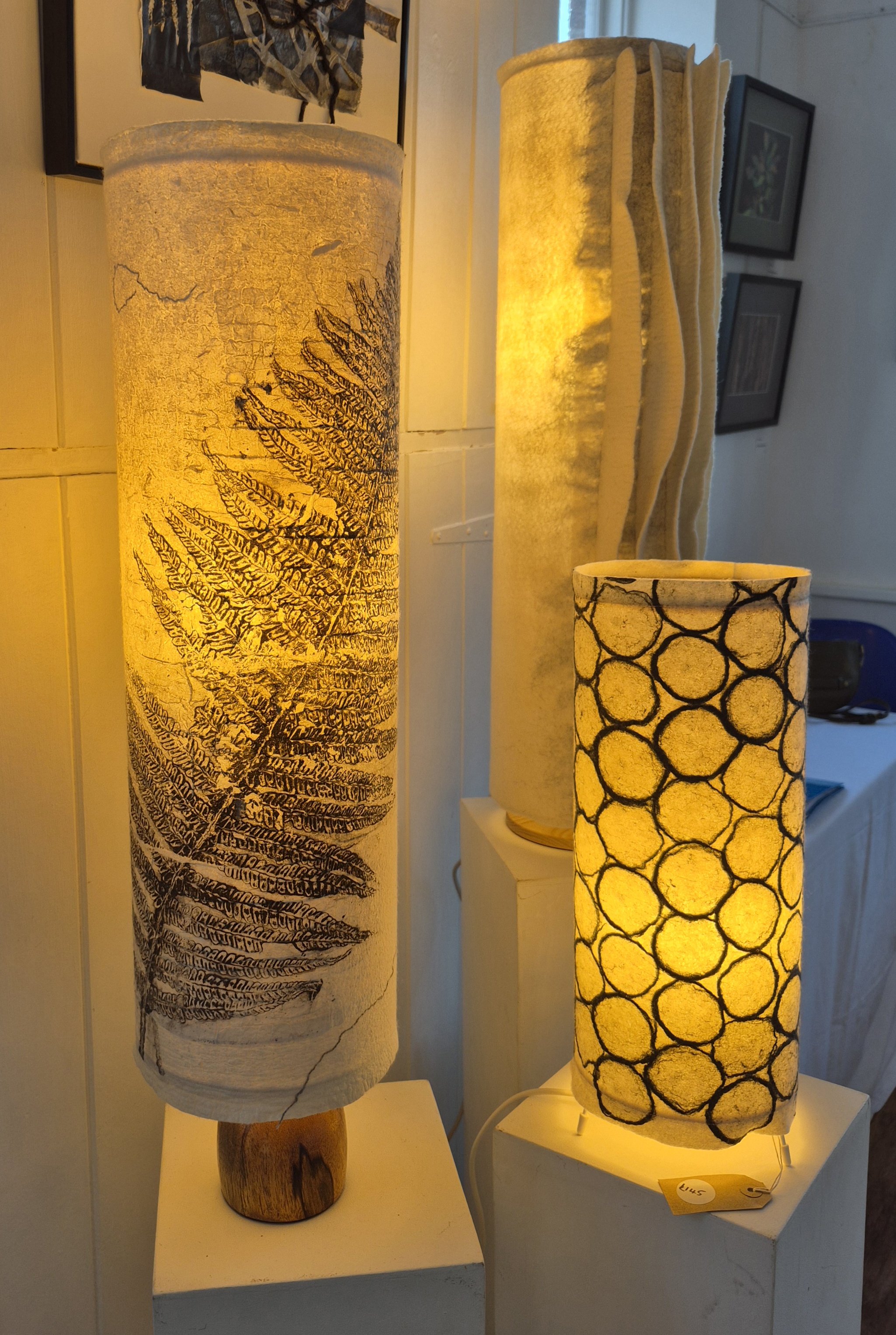 In the exhibition we placed work in groupings by each maker to create areas of harmony. A series worked using the same materials, such as Penny’s felted fins, gives a feeling of calm and cohesion. But placing objects made of wool next to Heather’s series of ‘Funky Moths’ creates a tension because of the threat that moths pose to wool. We found connections too – Mary’s 3D ‘mothballs’ worked well alongside the 2D moths created by Heather. Lighting was another link with the beautiful felted lamps and columns created by Penny being echoed by Mary’s candleholders – completely different styles and techniques but linked by a theme.