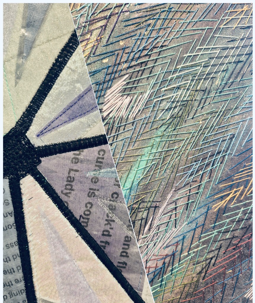 When I asked fellow Out of the Fold members Heather Evans and Penny Evans to exhibit alongside me at the Quay Gallery, Snape Maltings we had to decide what to call ourselves. This is not intended to be a permanent new textile group but a banner under which we can come together, occasionally, to exhibit. We considered “Three Fold” as we are a sort of subset of the main Out of the Fold group. However we decided upon the exhibition title of ‘Juxtaposition’ as it seemed to work for three artists whose inspirations, style and ways of working are all very different. The definition of Juxtaposition: the act of placing two or more different things together to compare and contrast or to create an interesting effect.