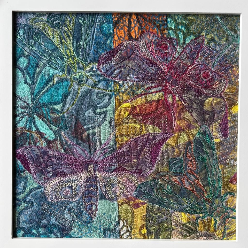 Mary McIntosh says “Working as a textile artist, alone in the workroom for many hours, can be quite a solitary and even lonely space. Working alongside other artists can help stimulate the creative process and offer technical advice. It is immensly valuable. Hanging an exhibition with fellow artists can be stimulating too, particularly with the Juxtaposition exhibition as the placing of each piece was considered carefully”