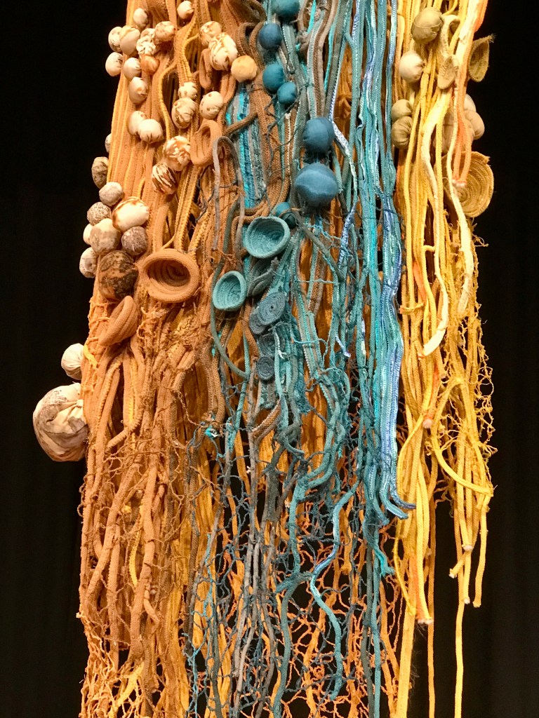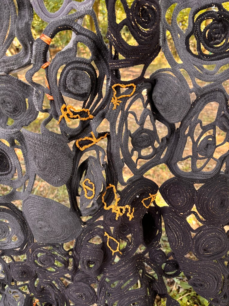 Both pieces are large hanging structures over 2 metres tall created with individual threads sewn together to suggest living branching, organic structures. They arise from something I want to express, a theme, feeling, a meaningful or significant event. I don’t plan the end result; it grows and develops into something that I haven’t forseen. There is a dialogue between my vision and the materials themselves. I am always surprised by the physical presence these textile structures seem to exude.