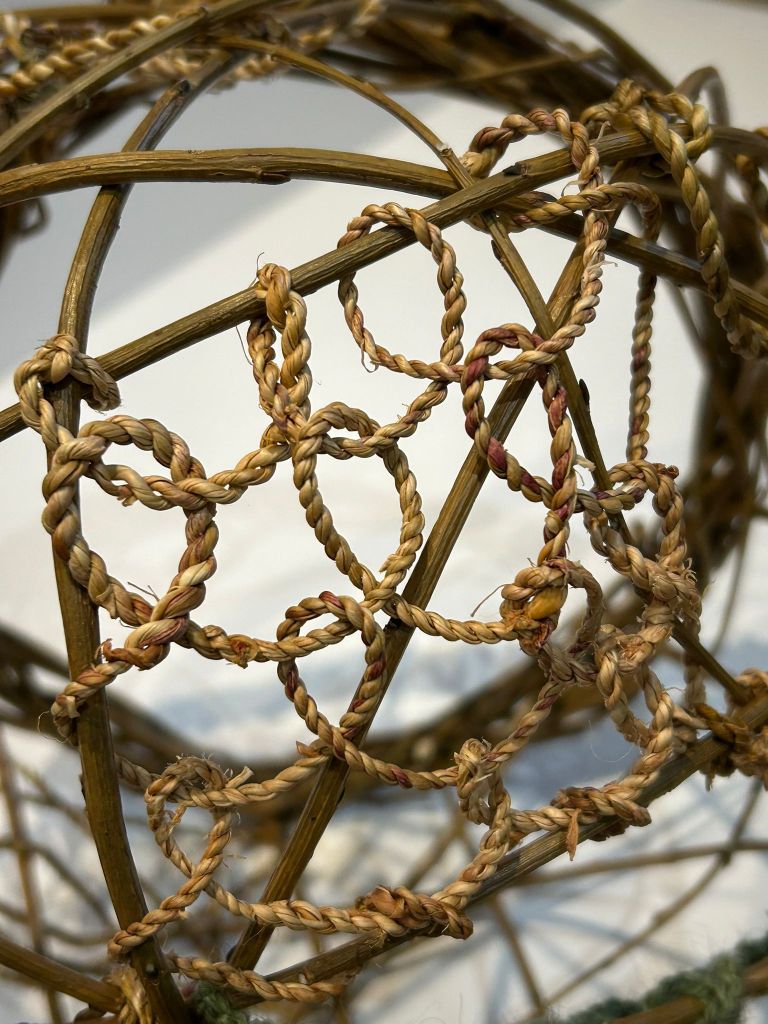 I’m sitting in my studio with the sun shining in and the door open as the temperature has jumped up by 10 degrees! The birds are singing and the snowdrops and daffodils dance their heads in the gentle breeze. Nature is waking up from the cold, damp winter months and is beginning to start her cycle of growth again. The trees still lay bare and old birds nests can be seen in the branches, reminding me that the birds will soon be busy preparing for their new young. It feels very much that nature is encouraging me to be outside but also create in response to this new awaking. I turn my thoughts to the daffodil, snowdrop and bluebell leaves I collected last spring that are still hanging up. Time to start working with these and so I get myself organised with days where I remember to put the leaves into ‘mellow’ before I want to work with them, the snowdrops and bluebells only need a couple of hours, but I find the daffodil leaves need about 5 hours to mellow so that they are soft to work with. I make cordage with them all, having worked with daffodil before I fall into a easy pace of making. The snowdrops leaves I only have a few and am surprised with the little pop of pink that shows through the cordage. The bluebell leaves go too wet, I try mellowing for less time but get the same result, whether I picked them to late, or how they dried or maybe bluebell leaves just don’t work, I’m not sure and will try again this year. This is what I enjoy about working with nature, you are never sure of the outcome and have to work with what happens.