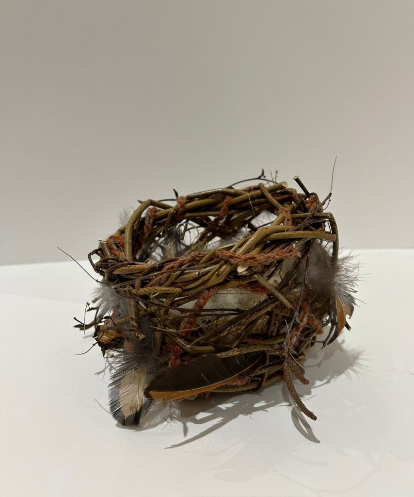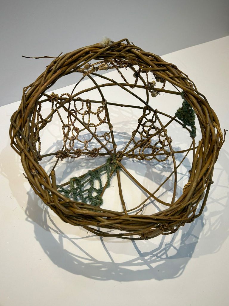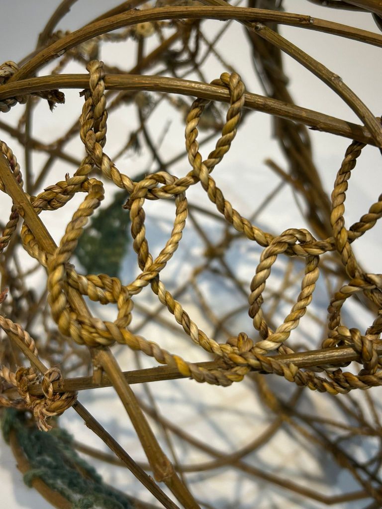 Inspired by the the birds nests I make a couple of nest vessels from willow, one adding natural dyed crochet wool to it and some feathers from my hens when they molted. The other I leave the nest more open and fill in the gaps with cordage I have made from the spring bulbs, looping and random weaving between the gaps. This shows the cordage off and creates the memories of spring and new life as nature wakes and causes these bulbs to grown again. Nature speaking out of the depths of winter, calling life and creativity in the world and my studio.