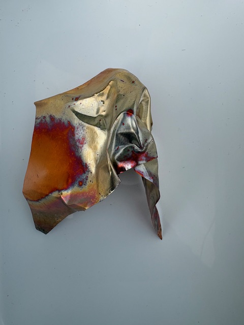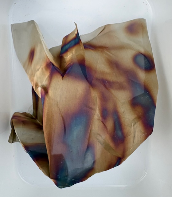 Although somewhat unpredictable, colouring metal by heating it gives amazing effects. A piece of copper may be shaped or textured before or after heating. Moving the piece in a flame allows colours to develop and move across it. Different metals develop different colour ranges. I also use alcohol inks.